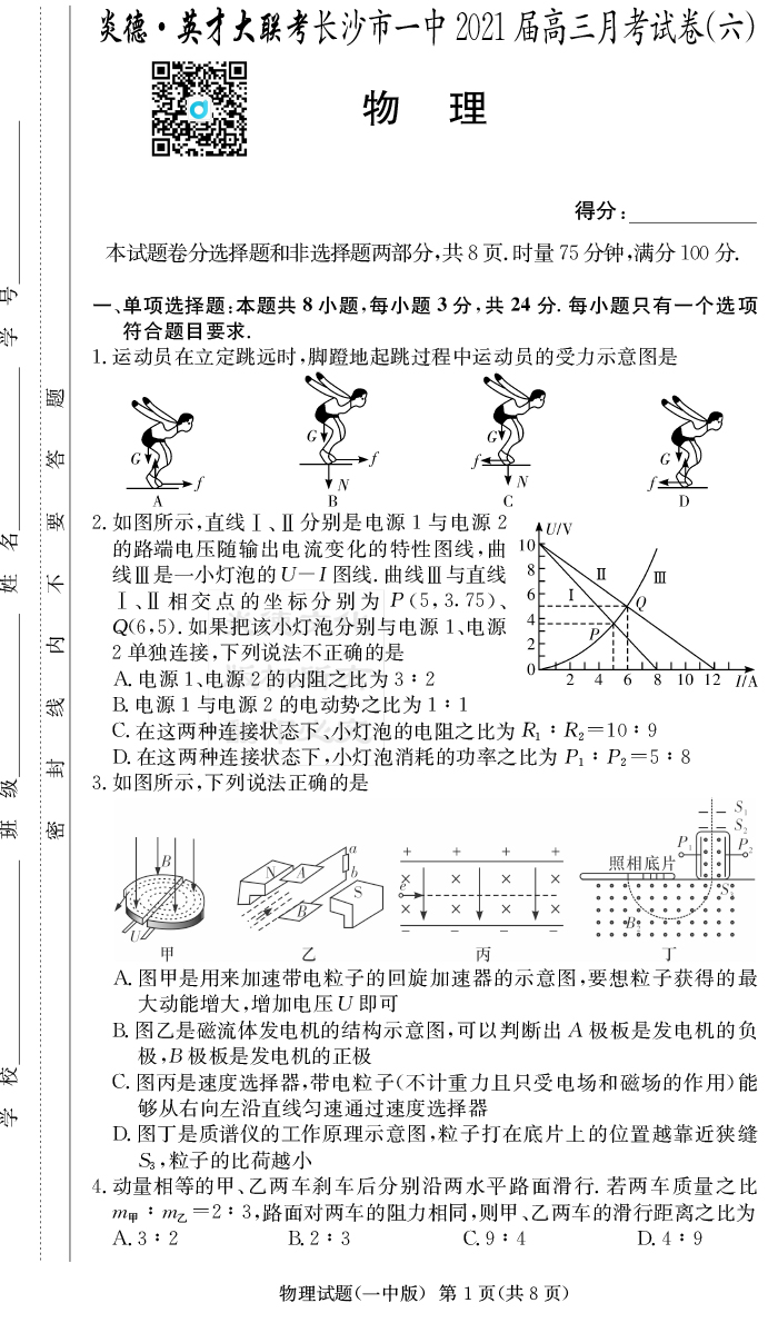 【物理】炎德英才大聯(lián)考2021屆長沙市一中高三6次月考