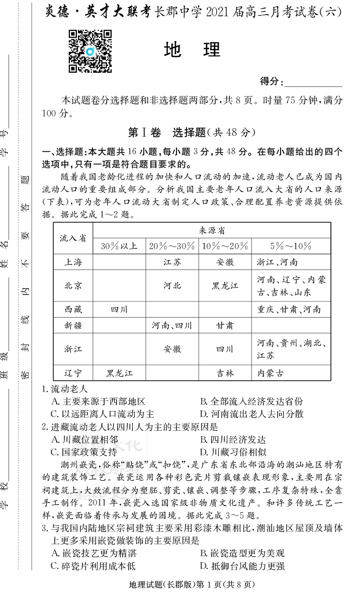 【地理】炎德英才大聯考2021屆長郡中學高三6次月考