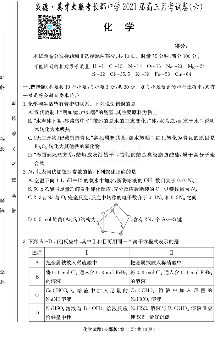 【化學】炎德英才大聯考2021屆長郡中學高三6次月考