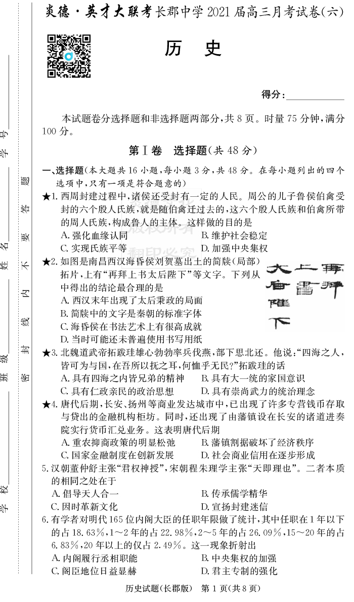 【歷史】炎德英才大聯考2021屆長郡中學高三6次月考