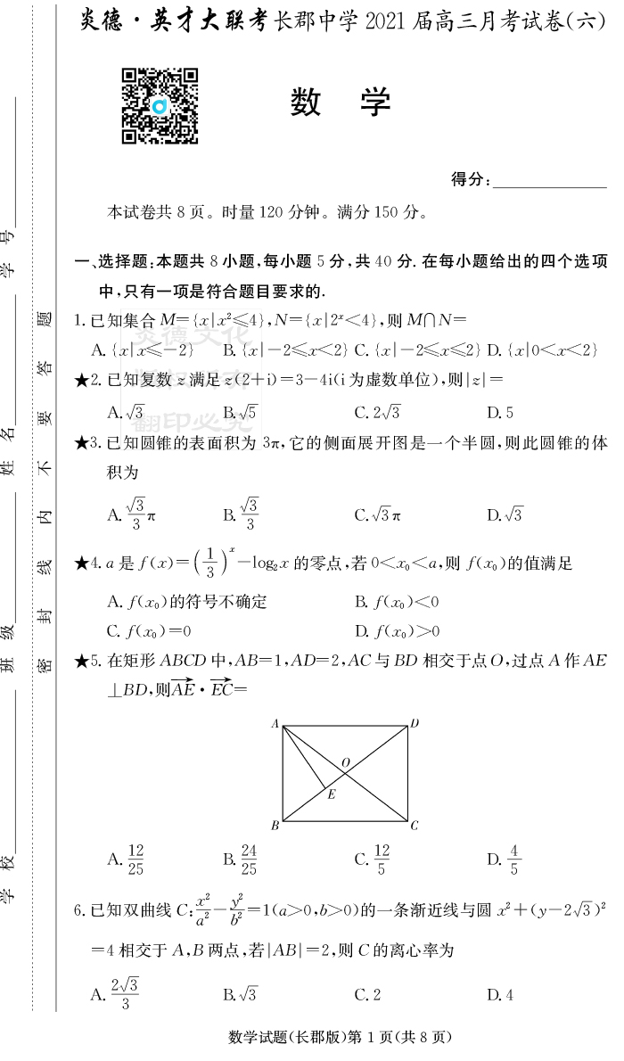 【數(shù)學(xué)】炎德英才大聯(lián)考2021屆長郡中學(xué)高三6次月考