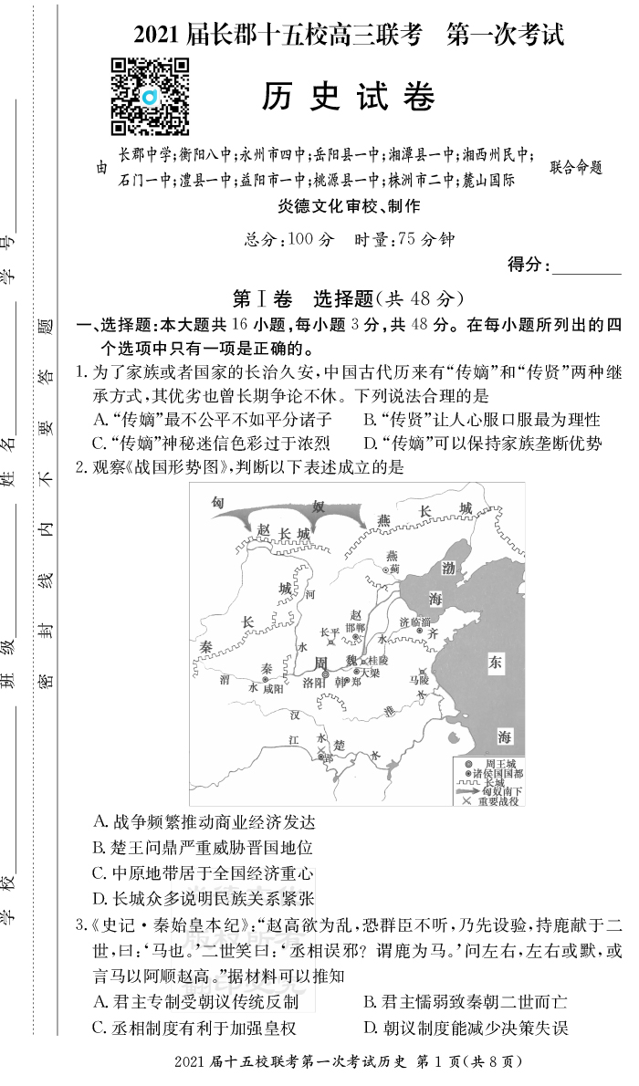 【歷史】炎德英才大聯(lián)考2021屆長郡中學(xué)高三7次月考(十五校聯(lián)考一)