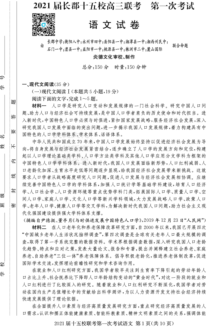 【語文】炎德英才大聯(lián)考2021屆長郡中學(xué)高三7次月考(十五校聯(lián)考一)