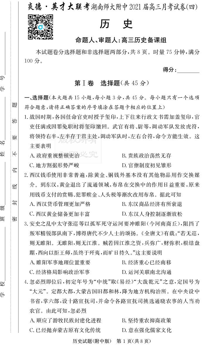 【歷史】炎德英才大聯考2021屆湖南師大附中高三4次月考