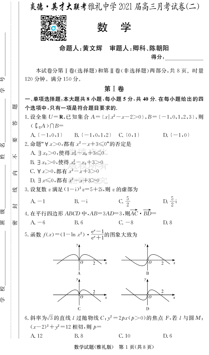 【數學】炎德英才大聯考2021屆雅禮中學高三2次月考
