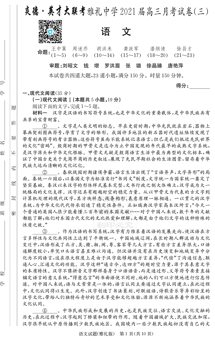 【語文】炎德英才大聯考2021屆雅禮中學高三3次月考