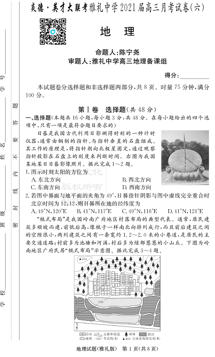 【地理】炎德英才大聯考2021屆雅禮中學高三6次月考