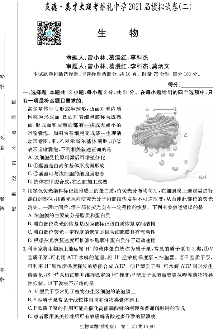 【生物】炎德英才大聯考2021屆雅禮中學高三10次月考(模擬二)