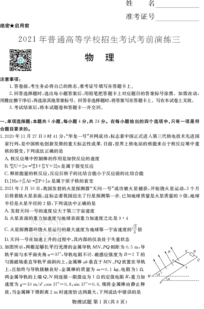 上一篇:【數學】2021年普通高等學校招生全國統一考試考前演練(三)