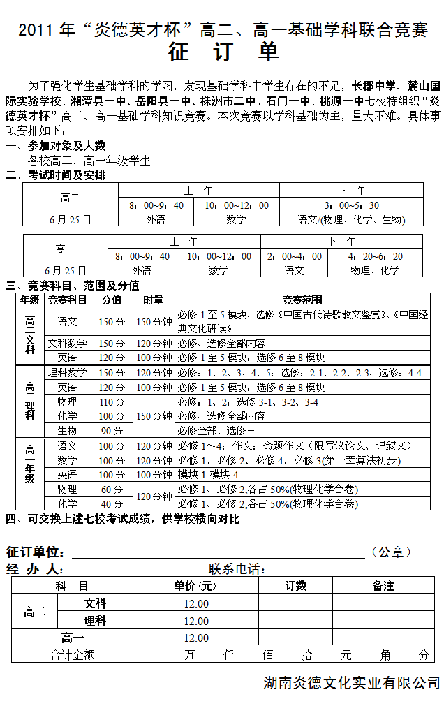 2011“炎德英才杯”高一高二基礎(chǔ)學(xué)科聯(lián)合競賽的征訂單