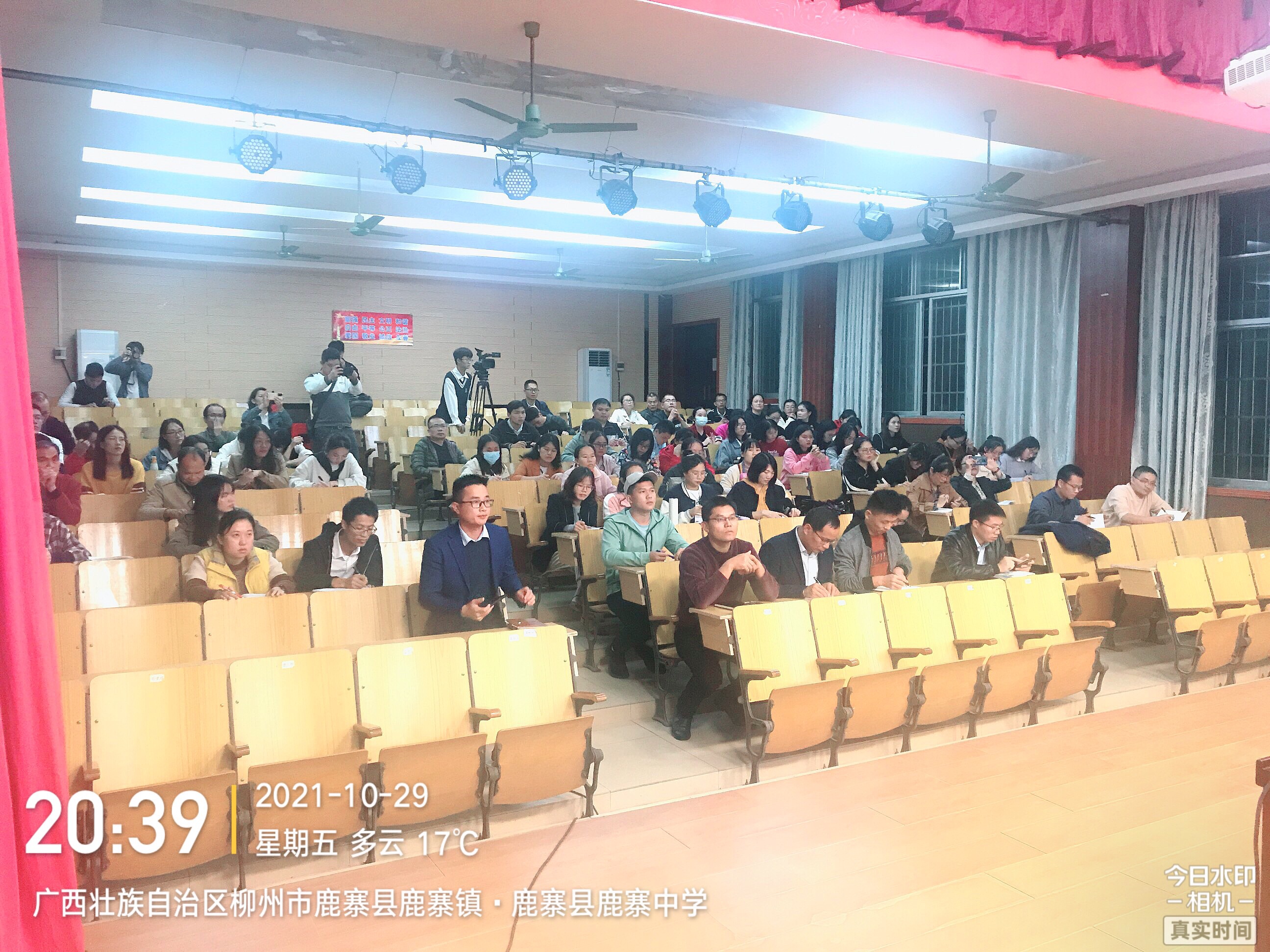 鹿寨中學全校80多名高一老師認真聽課,做筆記。