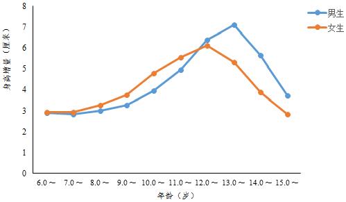 圖1 十年來監測地區6~15歲各年齡段學生平均身高增量