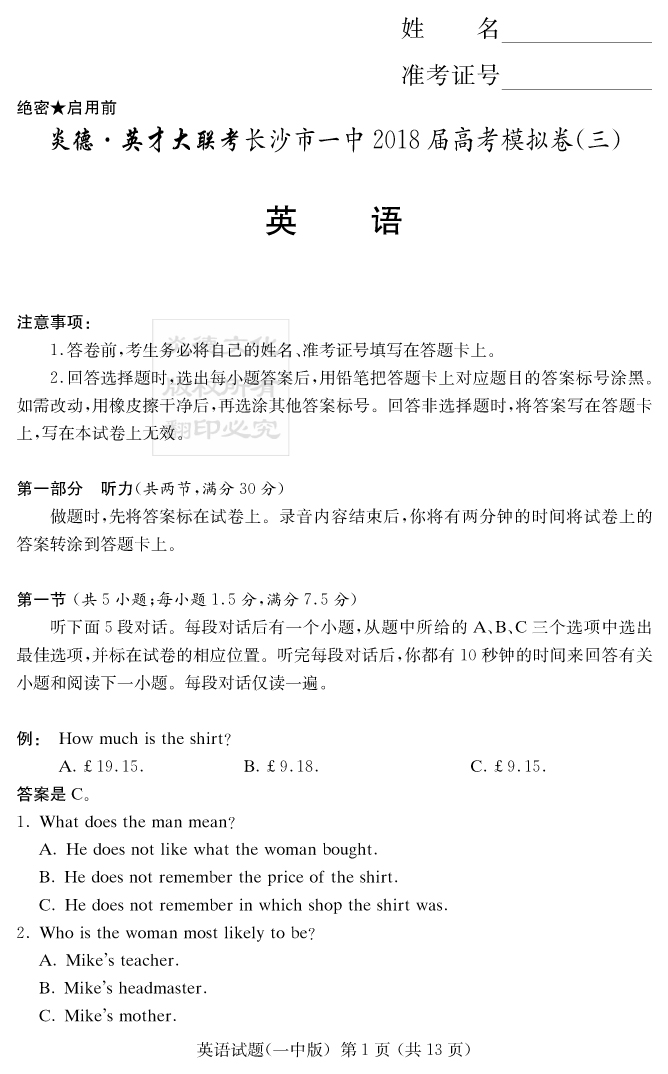 【英語(yǔ)】炎德英才大聯(lián)考2018長(zhǎng)沙一中高三12次月考(模擬三)